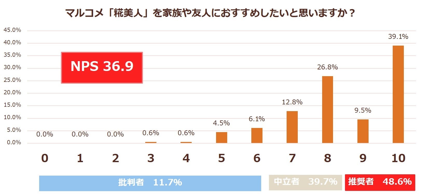 また2種のみそについて、周りへのおすすめ度合いを11段階から選択する推奨意向調査では、約半数の48.6%が推奨者とされる9,10を選択、NPS®(※)は36.9となりました。