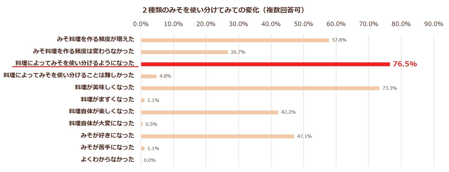 趣の異なる2種のみその試食体験を通して、参加者の76.5%が「料理によってみそを使い分けるようになった」、73.3%が「料理が美味しくなった」と回答。約9割が発売後に「購入したい」と回答し、約8割が購入後に料理に使う頻度は「週1回以上」と回答しました。