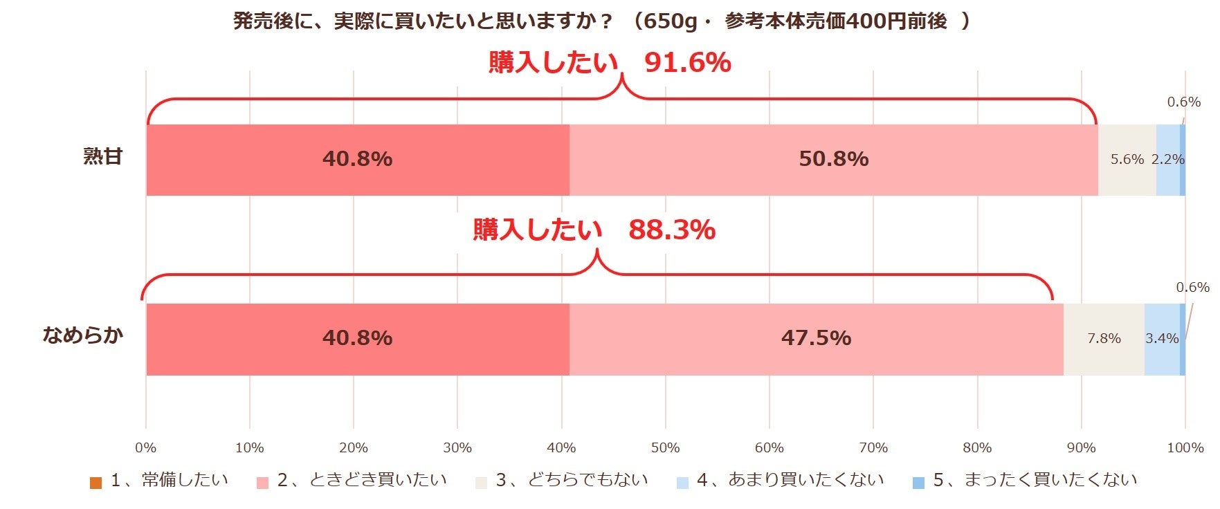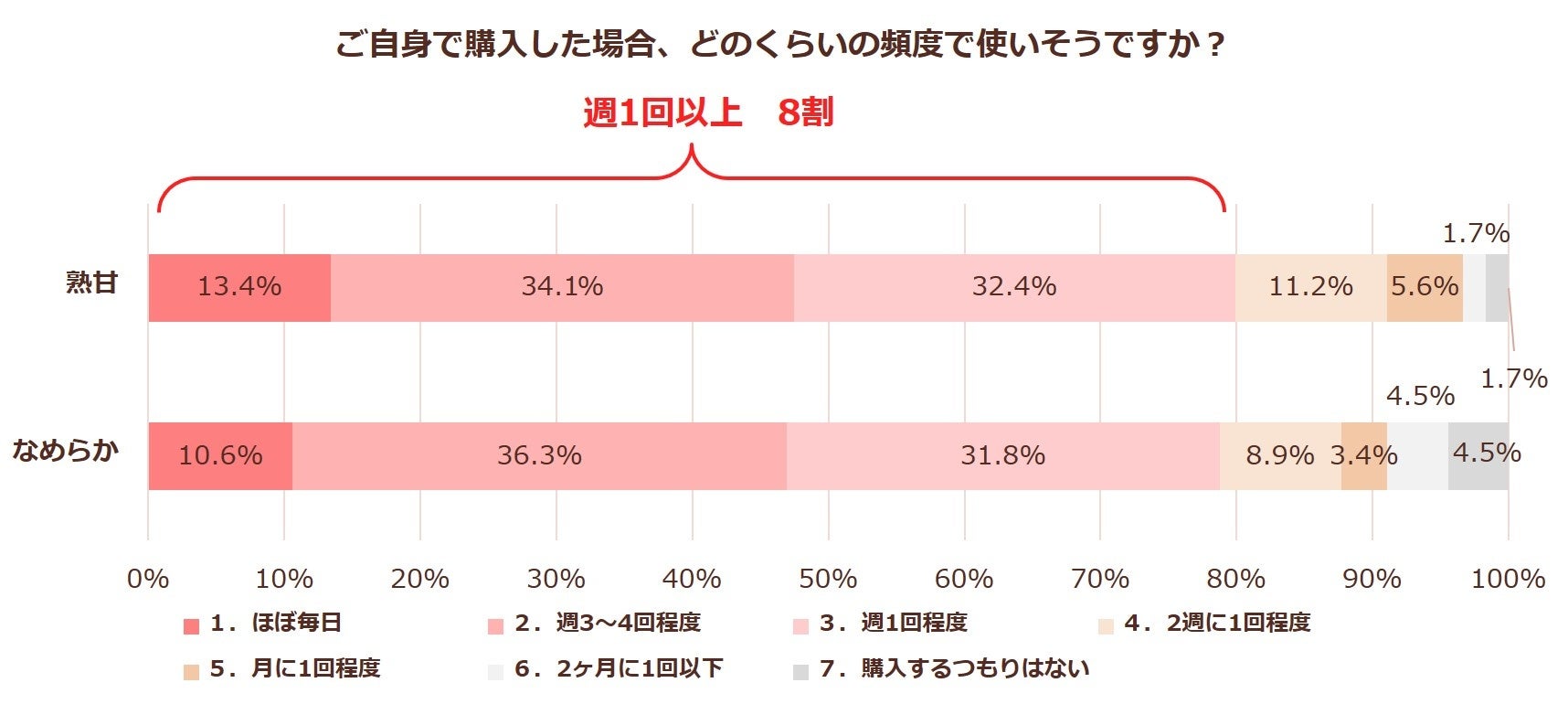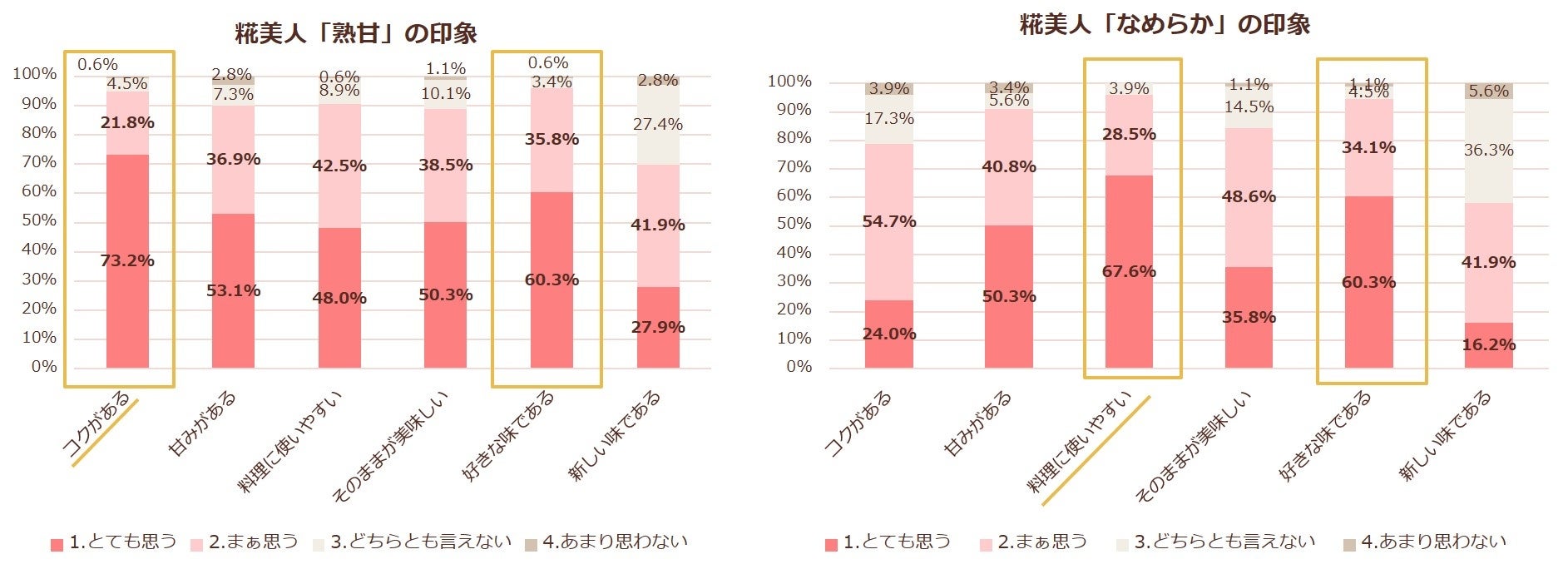 使ってみての印象では、「熟甘」は「コクがある」(95.0%)、「なめらか」は「料理に使いやすい」(96.1%)という回答に大きく特徴が出ました。また、2種ともに95%が「好きな味である」と回答していることから、「糀美人」既存ユーザーからは味への高評価がうかがえる結果となりました。それぞれの感想では、「熟甘」は味わいのコクや深み、「なめらか」は味わいの上品さ、溶けやすさから料理への使いやすさや調理の時短への評価が多く見られました。