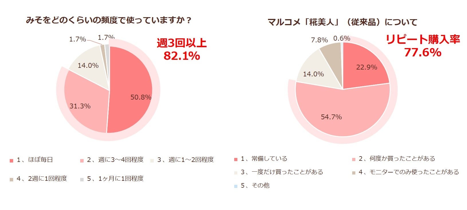 本テストマーケティングは、スナップディッシュユーザーの中で既存品の「糀美人」利用経験者200名を対象に実施しました。テストモニター参加者の82.1%が週3回以上みそを使っており、「糀美人」のリピート率は77.6%にのぼります。