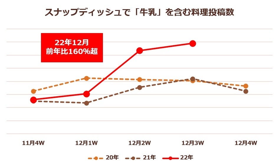 2022年12月初旬からスナップディッシュと農水省が連携して、「農林水産省牛乳乳製品課」アカウントと運営からの「#牛乳料理部」参加の呼びかけを開始。スナップディッシュでの「牛乳」を含む投稿数は12月は前年比164%に増加していることがわかりました。