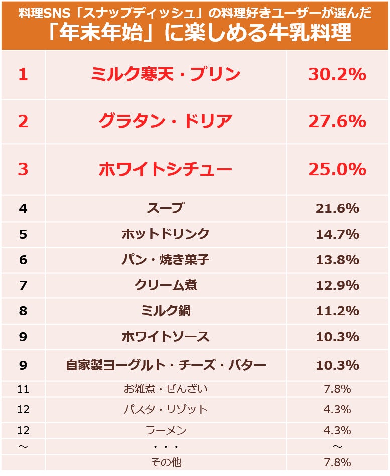 - 年末年始に楽しむ牛乳料理、1位は「ミルク寒天・プリン」、2位、3位はホワイトソースを楽しむ「グラタン」「シチュー」