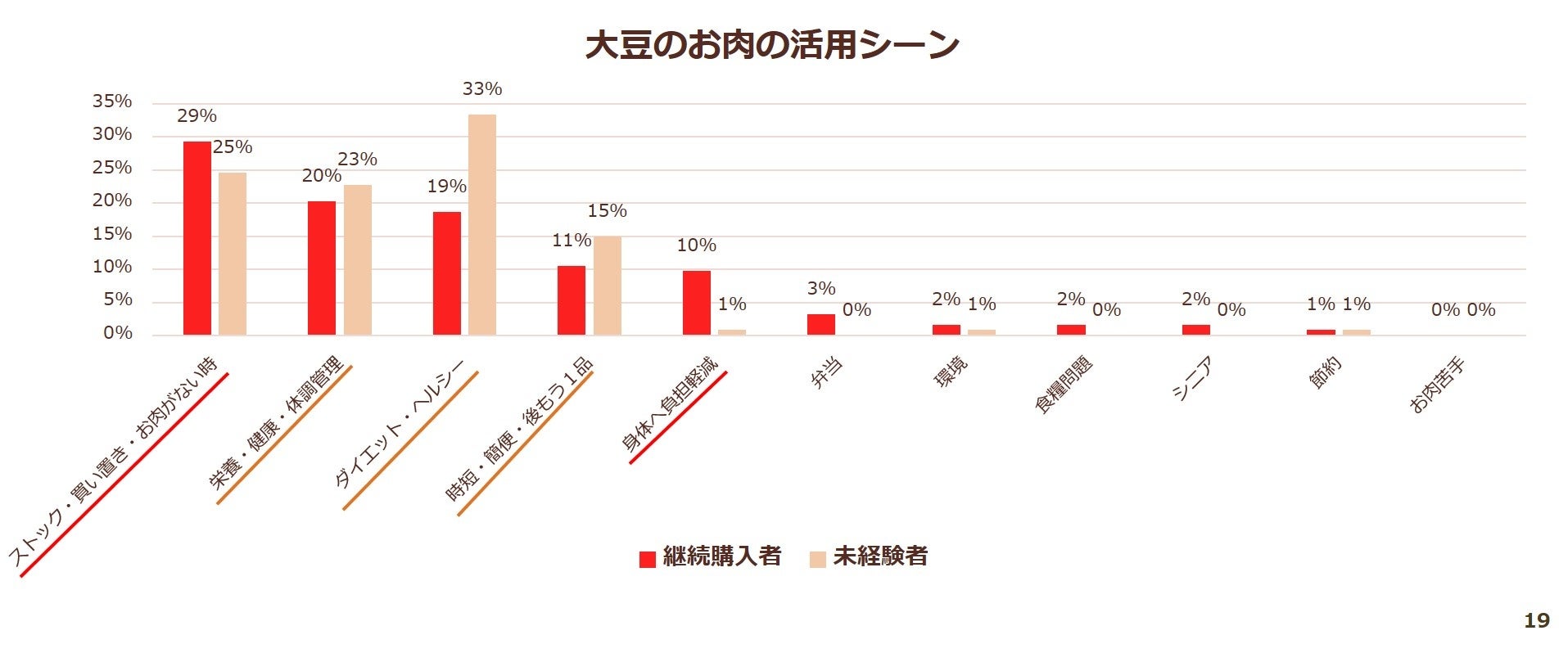 また、「大豆のお肉」の活用シーンでは、リピーターは「ストック・買い置き・お肉がない時」(29%)が最多となり、今回初めて使った方は「ダイエット・ヘルシー(な食事をしたい時)」(33%)が最多となりました。リピーターは特に「身体への負担を軽減したい時」(10%)が未経験者と比較して高く、使い慣れているからこそ気づくことができた活用シーンと言えそうです。