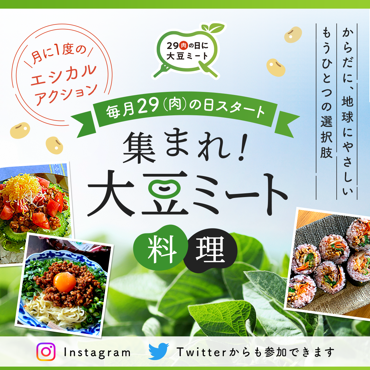 本プロジェクトでは、大豆ミートの喫食体験と大豆ミート料理のコミュニケーションの場を設けるべく、プロジェクトメンバー協賛による商品モニター企画と、毎月29日「肉の日」から1週間限定で「集まれ!大豆ミート」投稿キャンペーンを、スナップディッシュ、Instagram、Twitterで展開しています。