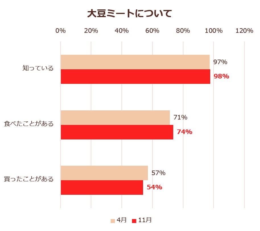 ・2022年11月時点での大豆ミートの認知率は98%、喫食経験率は74%、購入経験率は54%。4月からはほぼ横ばい。